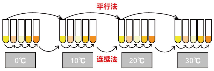 就像平行法那樣采用不同的水浴溫度,連續法需要與平行法一樣多的水浴,這里所有的批樣品在轉移到下一個水浴中預熱之前在相同的溫度下預熱。耗費的時間比平行法要長。