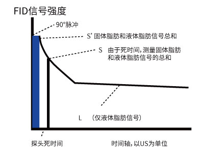 固態和液態脂肪中的H由于存在形式不同,在FID衰減曲線中表現出截然不同的特性。如下圖所示,固體脂肪信號衰減很快,一般在70微秒時已經完全衰減。液體脂肪信號衰減較慢,一般認為在70微秒處基本尚未損失。但是核磁共振信號采集存在一個特定的死時間,所以我們在死時間后采集到FID首點信號S時,固體脂肪的一部信號已經在死時間中衰減了(S’-S)。通過一定的信號處理即可得到固體脂肪含量SFC。