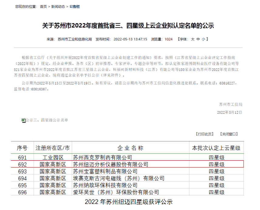近日,蘇州市工信局公示了蘇州市2022年度首批江蘇省四星級上云企業名單,蘇州紐邁分析儀器股份有限公司(以下簡稱“蘇州紐邁”)成功入選“2022年江蘇省四星級上云企業”。