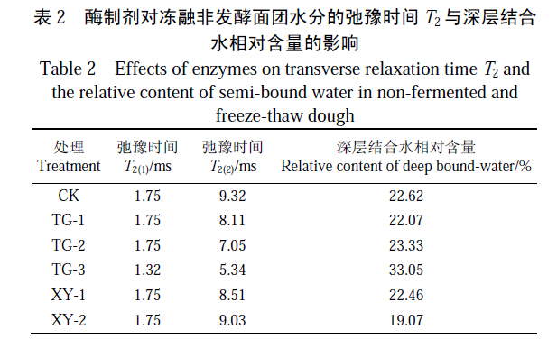 酶制劑對凍融非發酵面團水分的弛豫時間T2 與深層結合水相對含量的影響
