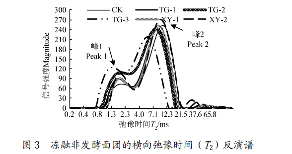 下圖中有2 個峰:峰1代表深層結合水,是與蛋白質和淀粉內部結合的水;峰2代表半結合水,是結合在蛋白質與淀粉之間的水。T2(1)、T2(2)分別表示峰1 與峰2 的弛豫時間,T2 表示水分自由度的大小,T2 越小說明水分結合越緊密,面團持水性越好。質子信號的強度是測定面團中水分狀態的一個重要指標,其與水質子量成正比,又與圖中波峰的積分面積呈正相關,通過觀察峰1 面積的變化可知面團中深層結合水的變化,即深層結合水相對含量=峰2 積分面積比例/(峰1 積分面積比例+峰2 積分面積比例)