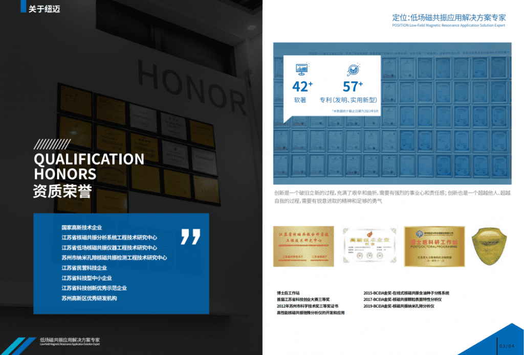 公司成立至今,已通過ISO 9001:2015質量管理體系認證、CE認證,建立了國家博士后工作站、江蘇省博士后工作站、研究生工作站和區研究生工作站,同時已被認定為江蘇省核磁共振分析系統工程技術研究中心、蘇州市低場核磁共振儀器工程技術研究中心、蘇州市納米空隙核磁共振檢測工程技術研究中心、蘇州市企業技術中心、江蘇民營科技企業、江蘇省科技型中小企業等。?