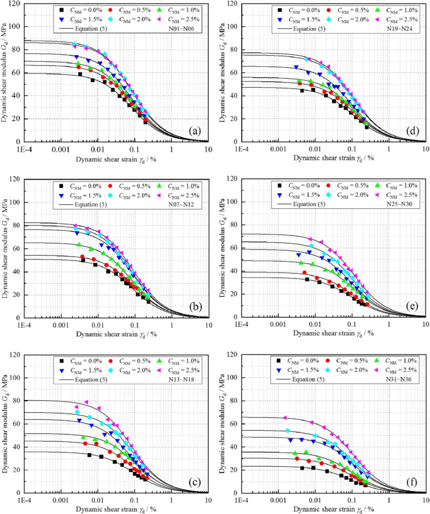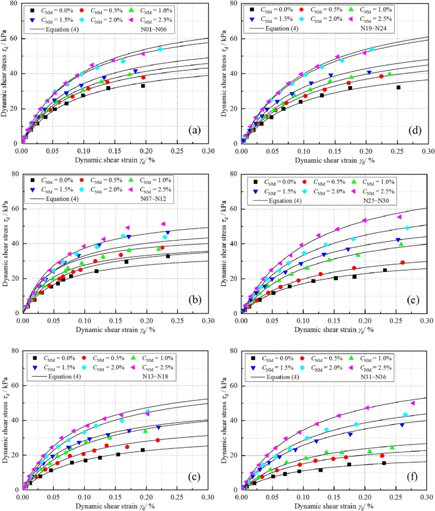 圖2顯示了NM含量為0%、0.5%、1.0%、1.5%、2.0%和2.5%時,凍融前后樣本的動態剪切應變-應力曲線。總的來說,所有的樣品都表現為應變硬化特性,都遵循Hardin模型。此外,曲線隨著NM的增加而向上移動,這表明在相同的應變水平下,較高的NM含量會導致較高的剪切應力。