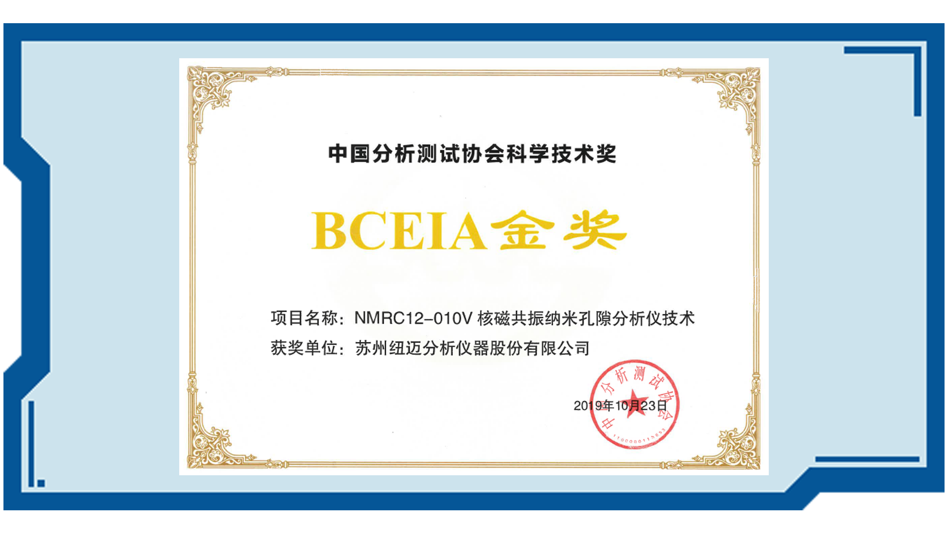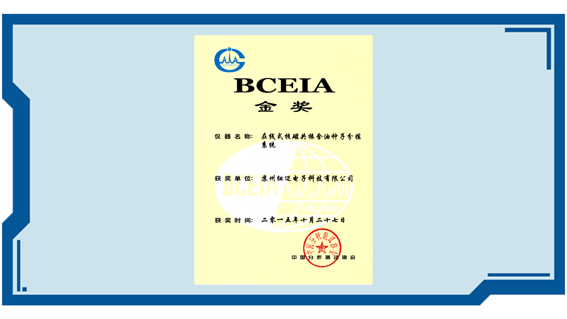 2015、2017、2019年,紐邁分析低場核磁產品蟬聯三屆科學儀器BCEIA金獎。
