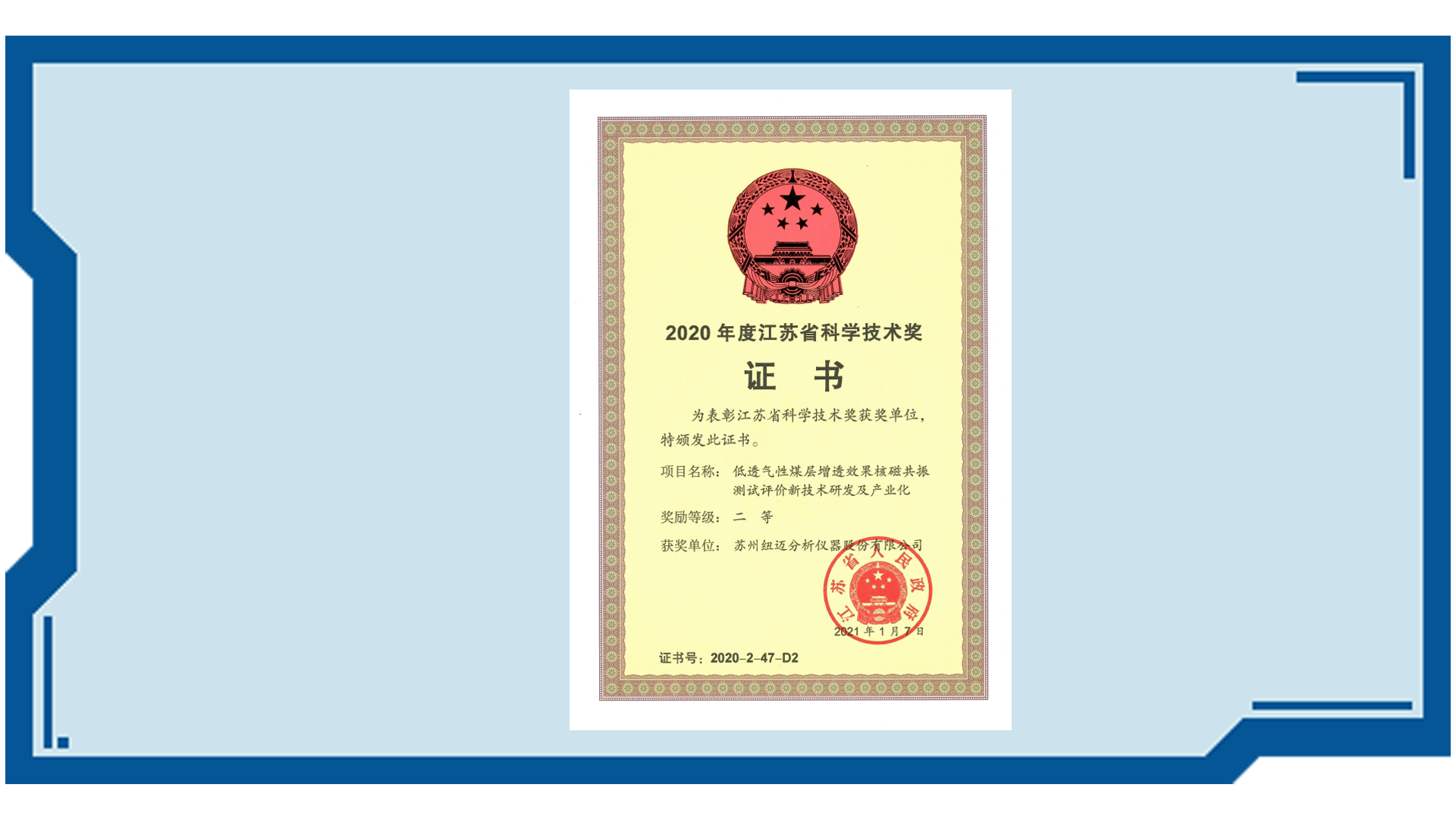 獲批《2022年度江蘇省外國專家工作室》,該工作室由江蘇省科學技術廳設立,獲得國家專精特新“小巨人”企業稱號,NMRC-L(1000mm)全直徑二維核磁共振測量儀被認定為江蘇省首臺(套)重大裝備和蘇錫常首臺(套)重大裝備。