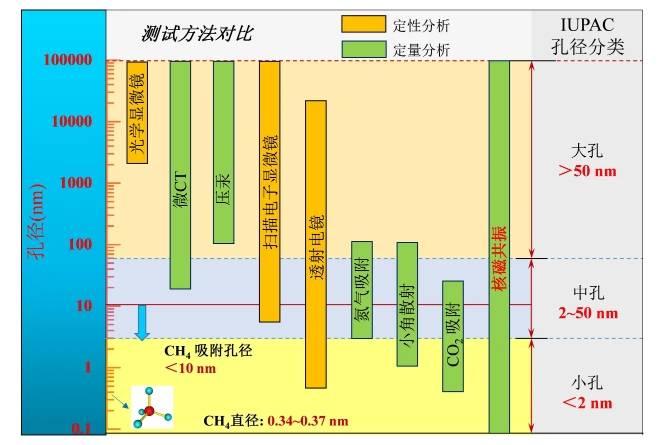 煤體的孔隙特征包括煤體孔徑的大小,連通性,以及孔隙數量的分布和比例。表征煤體孔徑的方法一般分為定性分析法和定量分析法,其中定性分析包括:光學顯微鏡,掃描電子顯微鏡和透射電鏡;定量分析方法包括:壓汞法,氮氣吸附法,二氧化碳吸附法,SAXS/ SANS,微型CT。上述孔徑測試方法在一些方面具有局限性:低的測試效率,有限的孔徑測試范圍,損壞原始孔隙結構。在圖1中,列出了不同孔隙特征測試方法的適用孔徑范圍:壓汞法(100nm~100μm),氮氣吸附(2~100nm),二氧化碳吸附(0.4~2nm),SAXS/ SANS(1~100nm)等。