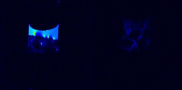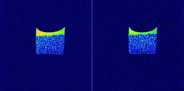 左圖的圖像上方較亮部分為水溶液,下方偏暗色區域為飽水的小玻璃珠。右圖的圖像中為非飽水樣品。由圖像可知在樣品內部水分分布并不均勻。大玻璃珠成像