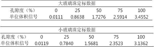 孔隙度測定由于大小兩類玻璃珠形成的孔隙大小不同,飽水后(孔隙完全被水充滿)孔隙內水的弛豫時間差別較大,定標時分別用純水做大玻璃珠定標線,用飽水后的小玻璃珠做小玻璃珠的定標線。定標數據如下: