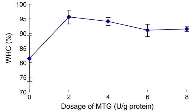 凝膠化過程與酶的交聯共同導致肌原纖維蛋白鏈的結合,從而產生一個連續的三維網絡,水被困在其中。WHC可以指示蛋白質結合水的能力,通常用于客觀評估肉類和肉制品的質量和產量。如下圖所示,隨著MTG從0到2U/g蛋白的增加,PMP凝膠的WHC從81.4%顯著增加到95.6%,但隨著MTG濃度從2到8U/g蛋白的增加,WHC沒有進一步增加。