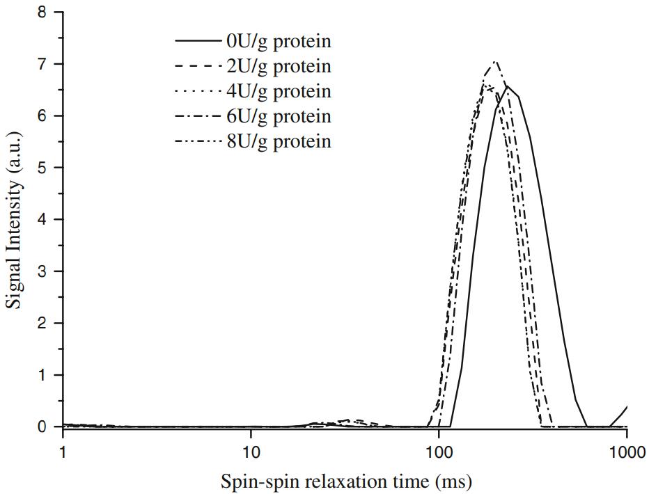 添加酶后,觀察到峰值(T2弛豫時間)的顯著變化,加酶后T2弛豫時間從對照組的226ms減少到2u/g蛋白質的188ms。但隨著酶濃度從2μg/g增加到8u/g蛋白,T2沒有進一步降低。
