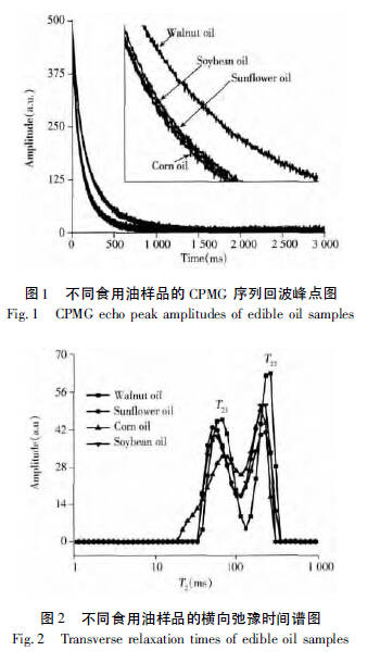 案例1:單一油樣將同一參數(shù)條件下測(cè)定的核桃油、玉米油、大豆油和葵花油的CPMG 弛豫衰減信號(hào)和T2弛豫檢測(cè)結(jié)果用專業(yè)軟件進(jìn)行T2反演,所得數(shù)據(jù)