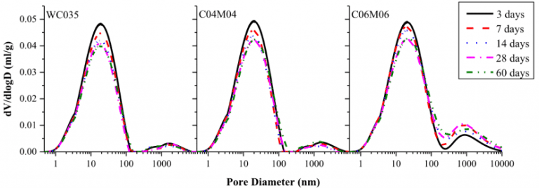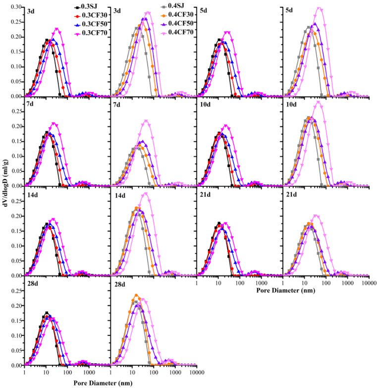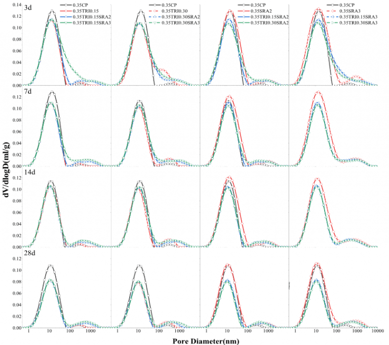 測試結果顯示,樣本的PSD通常包含兩個峰值。SRA和TRI的結合使用對樣本的PSD有明顯的影響。孔隙率隨著w/c和SRA含量的增加而變大,但隨著TRI含量的增加而下降。在28天內,同時添加SRA和TRI的樣品的孔隙率明顯低于沒有SRA和/或TRI的樣品[3]。