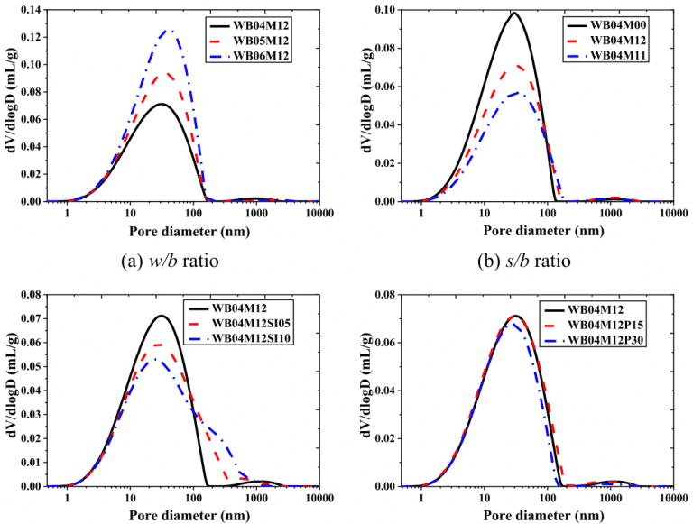 結果顯示,由孔隙大小分布決定的砂漿的等效孔隙半徑r 隨著水與粘結劑(w/b)比率和沙與粘結劑(s/b)比率的增加而增加,隨著二氧化硅煙塵(SF)和超吸收聚合物(SAP)含量的減少而減少。S值隨著w/b比和SF含量的增加而改善、隨著S/b比的增加而減小,砂漿的k值趨勢與S值趨勢相似[4]。