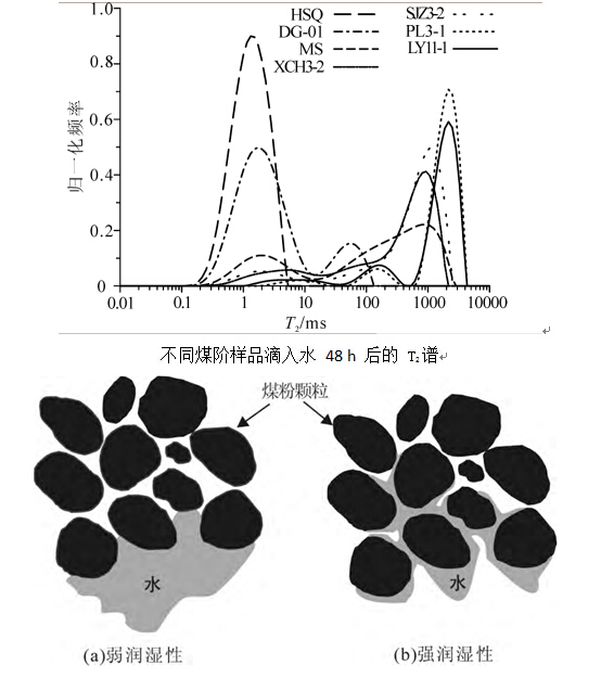 水滴入強水濕煤粉中測得T2弛豫譜僅存在吸附態水峰與顆粒間水峰,弱水濕煤粉則存在自由態水峰、顆粒間水峰和吸附態水峰。煤粉越水濕,水在煤粉顆粒間擴散越明顯,在顆粒間形成的水膜面積越大,使得顆粒間水峰和自由態水峰弛豫時間越短,隨時間變化向左移動規律越明顯。