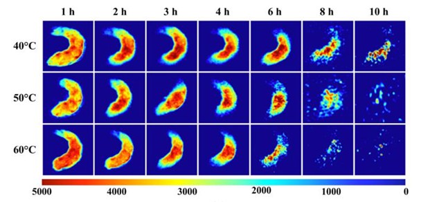 核磁共振成像已被證明是研究食品科學領域水分配的有效方法。下圖顯示了在40°C,50°C和60°C不同時間干燥的蝦的T2加權圖像的偽彩色圖像(低-高質子密度,藍紅色)。說明了具有流動性水的分布。隨著干燥時間的延長,較亮區域的大小顯示出持續減小的趨勢,這表明在干燥過程中失去了長弛豫信號。注意到隨著在三個溫度下干燥時間的增加,信號強度從外表面到內部區域減小。