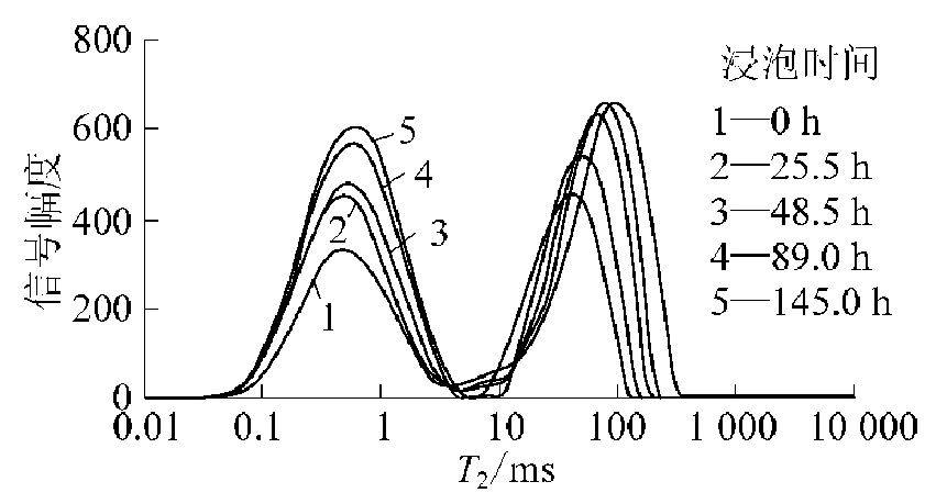 從上圖可以看出,核磁共振T2譜為雙峰結構,隨著吸水時間的增加,吸附水峰的面積逐漸增加,毛管束縛水峰向左緩慢移動,峰面積有所降低,但不明顯。