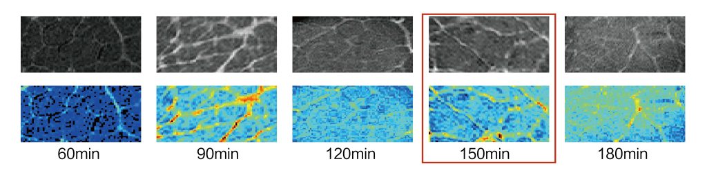 T1加權像中,網狀紋理是牛肉中脂肪,較暗的部分為牛肉中肌肉組織,隨著鹵制時間延長,脂肪溶解,網狀紋理變亮,隨后脂肪溶出,水分進入,圖像整體變亮,網狀紋理消失。