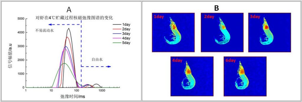 (A)對蝦4℃貯藏過程核磁共振T2弛豫圖譜的變化;(B)不同貯藏時間的核磁共振質子密度相;