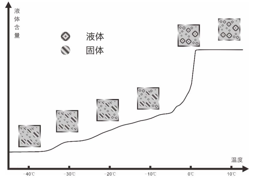 核磁共振冷凍測孔法的實質是利用流體固、液態核磁共振弛豫性質的差異來表征孔隙結構特征。在實際測量過程中,首先將某種液體(一般為潤濕性液體)飽和填充于待測的多孔固體材料中,通過儀器配備的冷卻裝置進行變溫操作,測量相應相變過程的液體變化量,從而獲得熔化(或凝固)曲線,分析孔隙的相關信息。