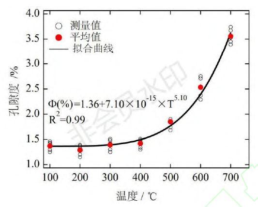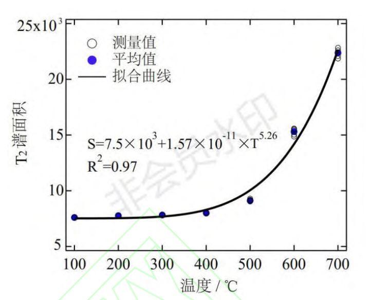 從上圖可以看出,核磁共振孔隙度與溫度之間的變化規(guī)律,與T2譜面積變化規(guī)律相似,在高于500℃時(shí),內(nèi)部結(jié)構(gòu)變化顯著,均呈現(xiàn)為冪律函數(shù)形式增加。