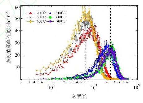 上圖為不同溫度花崗巖試樣像素值的概率密度函數(shù)分布圖,所有對應(yīng)溫度下的成像分布遵循對數(shù)正態(tài)分布。隨溫度升高,曲線向右大幅度移動(dòng),較大像素值增加,巖石內(nèi)部損傷加劇,概率密度峰值所對應(yīng)的像素值增大并向右轉(zhuǎn)移,像素分布遷移規(guī)律與T2譜圖分布變化特征一致,能定量表示花崗巖在高溫作用下內(nèi)部結(jié)構(gòu)損傷過程。