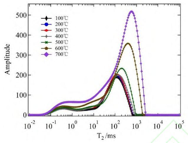 當(dāng)溫度從500℃逐漸升級至700℃時(shí),右側(cè)峰曲線所對應(yīng)的T2譜范圍擴(kuò)大,左峰和右峰信號幅值顯著增強(qiáng),譜范圍持續(xù)擴(kuò)大,表明持續(xù)的熱損傷加劇導(dǎo)致了巖芯內(nèi)部微裂紋、穿晶裂紋的出現(xiàn),使得裂紋的長度和數(shù)量不斷增加,同時(shí)隨著溫度的升高,較小的裂紋也會(huì)逐漸演變?yōu)榇蟮牧鸭y。