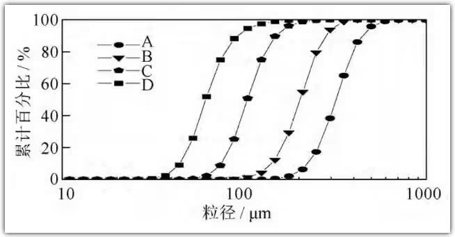 試驗選用煤粉作為原材料,經50、70、100、200、270目篩網篩分得到樣品,然后經水洗篩分,烘干后得到顆粒粒徑相對單一的A、B、C、D四種煤粉,各自的顆粒粒徑分布見圖1,顆粒粒徑及不均勻系數見圖2。