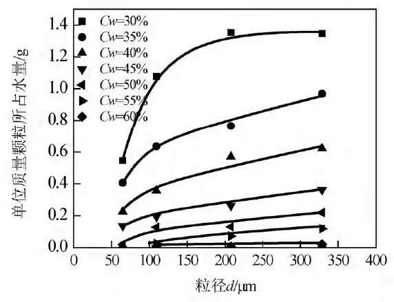 圖6a為不同濃度下,顆粒粒徑對間隙水量的影響,從整體變化趨勢來看,在一定濃度下,間隙水量隨顆粒粒徑的增加而減少,其變化幅度以濃度55%為分界線。