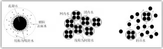 水煤漿中存在三種不同狀態的水分,分別為顆粒表面的吸附水、顆粒間的間隙水、自由水,三種水分由于其物理化學狀態不同,自由活動能力存在本質差異。具體如下圖所示。