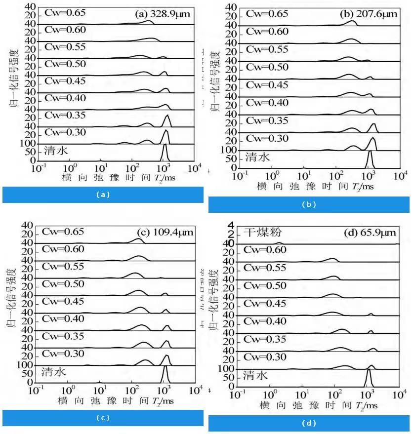 不同濃度、不同粒徑的水煤漿反演后的弛豫信號如下圖3所示。