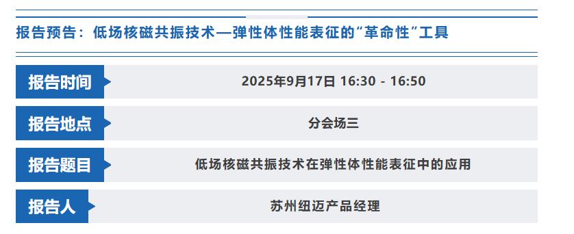2025年9月17日下午16:30-16:50,分會場三,蘇州紐邁期待與您相遇,共同探討低場核磁共振技術(shù)的無限可能,攜手推動彈性體材料邁向更高性能、更綠色智能的未來!