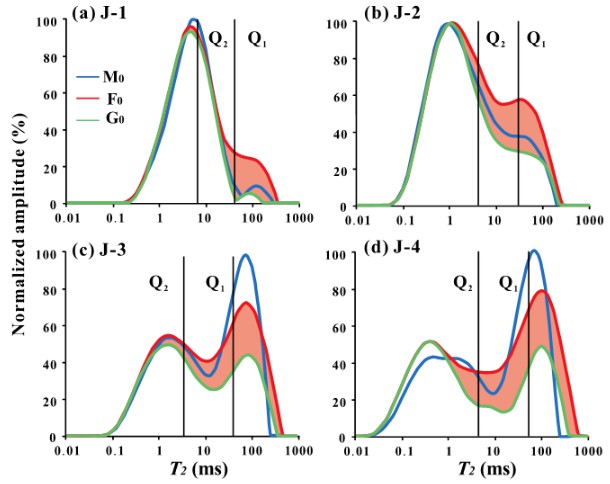 圖2.壓裂前樣品飽和輕油T2譜(J-1和J-2取自吉木薩爾凹陷,J-3和J-4取自西湖凹陷)