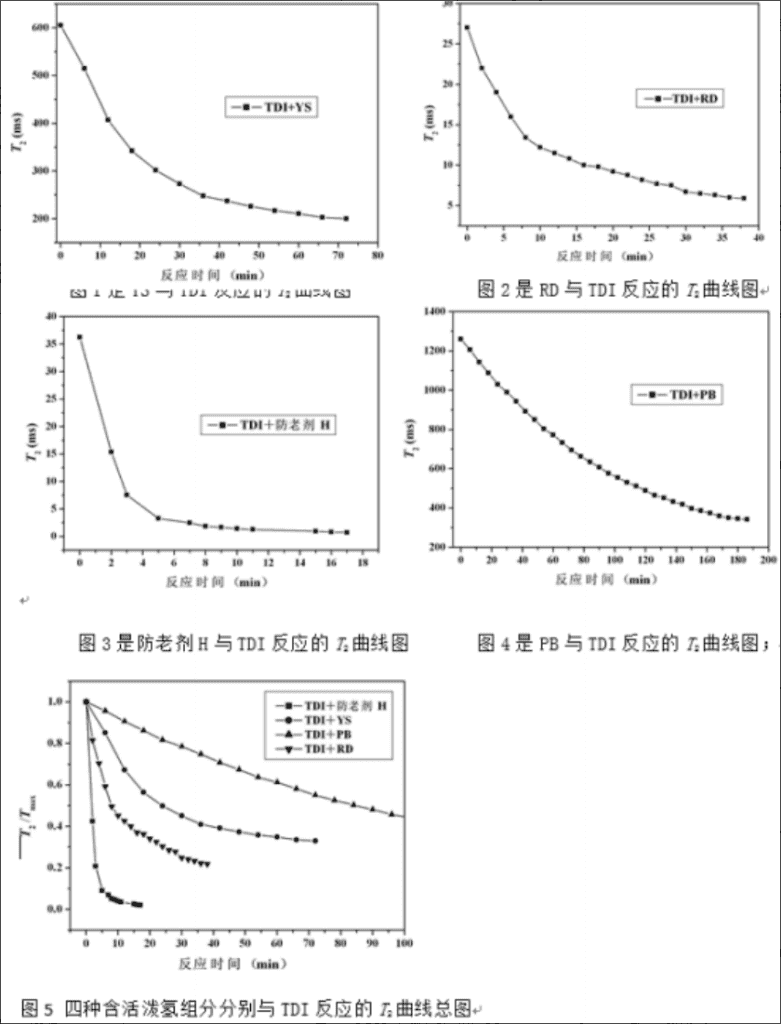 1) 獲得TDI與四種含活潑氫組分的反應活性順序為:防老劑H > RD > YS > PB。