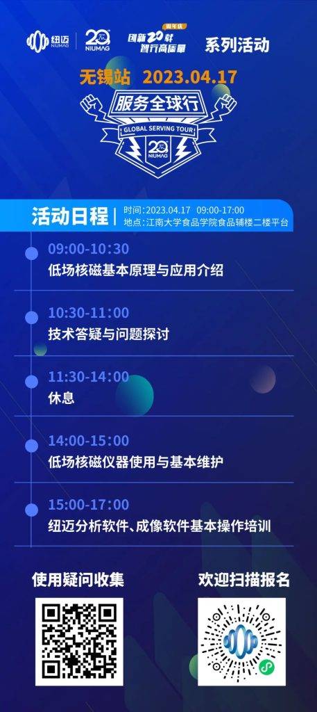 正是江南好風景,落花時節(jié)又逢君。紐邁分析第四屆服務全球行2023年度活動第二站,4月17日(周一)與您相約江南大學,無錫站。大家在使用設備的過程中出現(xiàn)過哪些問題?可以填寫使用疑問收集表,我們將會根據收集的問題來準備本次活動內容。 活動內容暫定如下,如有調整,我們會通過公眾號發(fā)布最新日程。請大家持續(xù)關注紐邁分析公眾號信息。