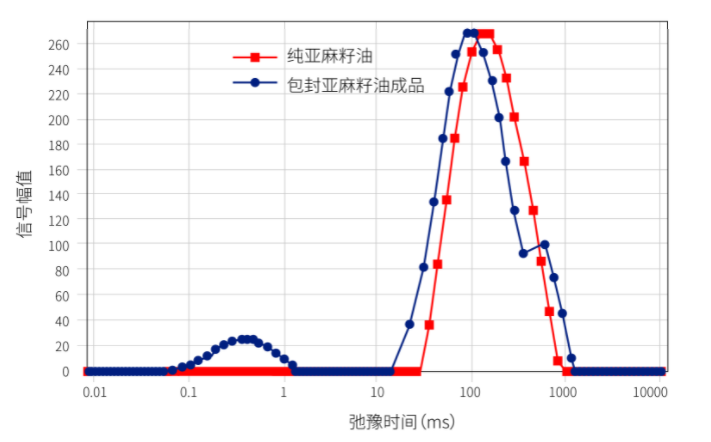 一份包封后的亞麻籽油成品,以及一份原料亞麻籽油(由蘇州本地一家實驗室購買,確保包封的亞麻籽油與原料亞麻籽油是同一批次)。通過低場核磁共振設備檢測,其弛豫時間相關譜如下: