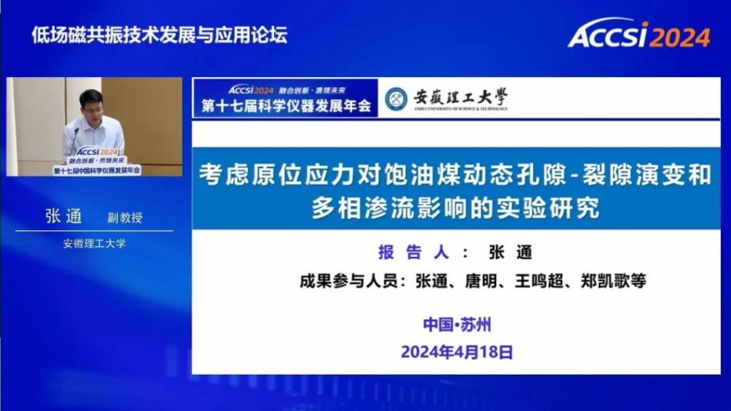 張通副教授分享了低場核磁技術(shù)在煤炭領(lǐng)域原位應(yīng)力應(yīng)變方向的應(yīng)用,研究了油飽和煤中動態(tài)孔隙—裂縫演變和多相滲流的機理。