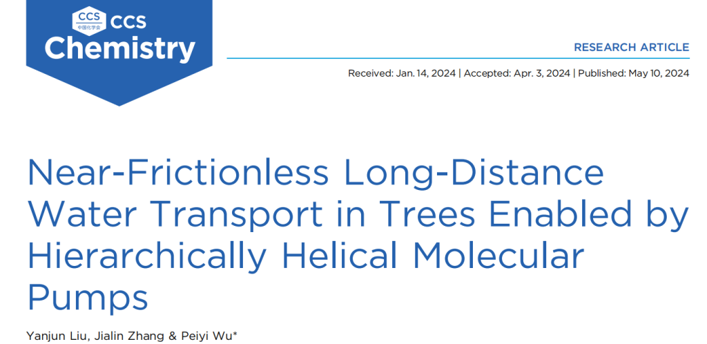 [1] Yanjun Liu, Jialin Zhang and Peiyi Wu.Near-Frictionless Long-Distance Water Transport in Trees Enabled by Hierarchically Helical Molecular Pumps.CCS Chemistry, 2024,0,1–9