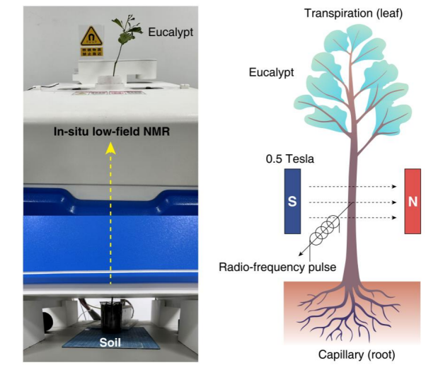 在高大樹木中,水分的上升是一種復(fù)雜的現(xiàn)象,受多種因素影響,包括木質(zhì)部導(dǎo)管復(fù)雜的分層結(jié)構(gòu)、木質(zhì)部導(dǎo)管內(nèi)的負壓的變化以及水分子與木質(zhì)部導(dǎo)管壁之間的相互作用。這里提到的復(fù)雜性超出了內(nèi)聚-張力理論的解釋能力。為了準(zhǔn)確理解木質(zhì)部導(dǎo)管內(nèi)水分的動態(tài)行為,該文獻利用低場核磁設(shè)備原位追蹤活樹中的水的運輸過程。