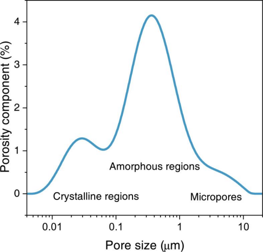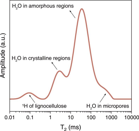 0.09 ms的超短T2時間歸屬于木質(zhì)纖維素的質(zhì)子弛豫。兩個較短的T2時間(2 ms和40 ms)分別歸因于納米級狹縫內(nèi)的水,它們分別與纖維素的晶體區(qū)和非晶區(qū)相關(guān)。長T2時間(600 ms)歸屬于微米級木質(zhì)部導(dǎo)管內(nèi)的水。上述結(jié)果通過孔徑分布分析進一步得到證實。非晶區(qū)水的T2振幅遠高于其他區(qū)域,表明水主要集中在木質(zhì)部導(dǎo)管壁內(nèi)纖維的非晶區(qū)。同時,木質(zhì)部導(dǎo)管僅含極少量的水,表明這些導(dǎo)管內(nèi)存在大量的空洞。