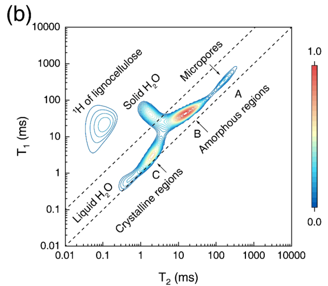 如圖 4 所示,(T2 = 0.1,T1 = 24)的自旋布居被分配給活桉樹的木質(zhì)纖維素中的質(zhì)子。對角線附近的自旋布居被分配給活桉樹內(nèi)的水。更具體地說,(1.7,2.3)和(1.9,49.6)的自旋布居被分配給結(jié)晶區(qū)域的水,(16.6,42.5)被分配給非晶態(tài)區(qū)域的水,(168.1,391.7)被分配給木質(zhì)部導(dǎo)管中的水。特別地,結(jié)晶區(qū)域中水的自旋布居呈現(xiàn)出兩種不同的形狀,一個平行于對角線的紡錘體和另一個垂直于對角線的紡錘體。