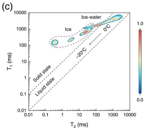 從遷移率的角度來看,當(dāng)T1/T2 = 10時(圖 5),固體和液體之間的分界線出現(xiàn)。結(jié)晶區(qū)域中垂直于對角線的自旋布居的T1/T2比值為26。這表明一些水被困在螺旋纖維結(jié)晶區(qū)域的半無序表面。這種嵌入半無序表面的固態(tài)水表現(xiàn)出類似于冰的特性。