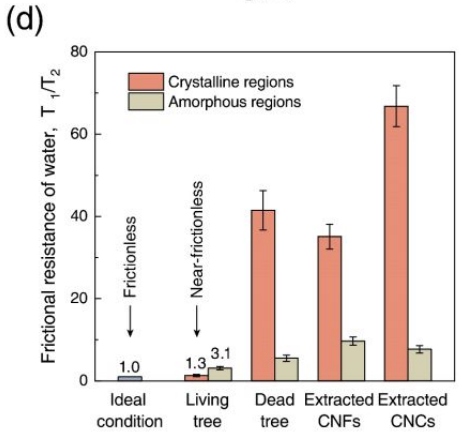 T1/T2比值量化了水分子通過多尺度狹縫的摩擦阻力。結(jié)晶區(qū)域內(nèi)水的T1/T2比值僅為1.3,接近理想的無摩擦狀態(tài)(T1/T2 = 1)(圖 6)。結(jié)晶區(qū)域的狹窄通道被一層類似冰的自潤滑層所覆蓋,這使得水能夠以近乎無摩擦的超流體狀態(tài)流經(jīng)這些區(qū)域。這種類似冰的自潤滑層是僅在活樹中觀察到的獨特特征。在樹木死亡或與樹木分離時,這些區(qū)域內(nèi)水分子的摩擦阻力顯著增加,在死亡的桉樹、提取的CNFs和CNCs中分別達到41.5、35.1和66.8。這種增加主要是由于類似冰的自潤滑層的缺失。