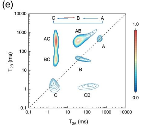 二維(2D)低場核磁共振圖提供了T1和T2 的組合。T2 時間對應(yīng)于水的活度,時間越長表明活度越高。T1/T2 比值對應(yīng)于水的流動性,比值越大表明流動性越差。自旋布居的形狀與水的狀態(tài)密切相關(guān)。圓形自旋布居模式表明水在封閉空間中處于平衡狀態(tài)。相比之下,紡錘狀自旋布居模式表明水在開放空間中正在經(jīng)歷交換過程。當(dāng)紡錘狀模式平行于對角線時,表明存在完全開放的空間,水可與外部環(huán)境自由交換。當(dāng)紡錘狀模式與對角線正交時,水被限制在部分封閉的空間中,其運動受到周圍環(huán)境的限制。