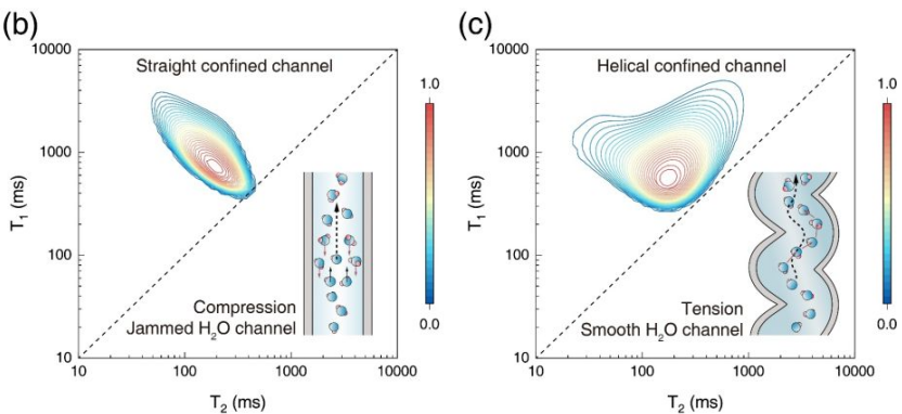 對齊取向的 CNF 微管中水的T1-T2譜圖顯示出垂直于對角線的紡錘形圖案,表明水分子在向上運動過程中受到顯著斥力(圖 8)。相比之下,螺旋狀CNF微管中顯示出與對角線平行的紡錘形圖案,表明水分子向上運動順暢。結(jié)果表明,當(dāng) CNF在微管內(nèi)呈螺旋排列時,水所受張力小于垂直排列時的情況。此外,水在螺旋納米纖維之間的縫隙中水平積聚,形成了一個新的“基準(zhǔn)面”,抵消了作用在水上的部分重力,從而降低了水分上升過程中的能量消耗。