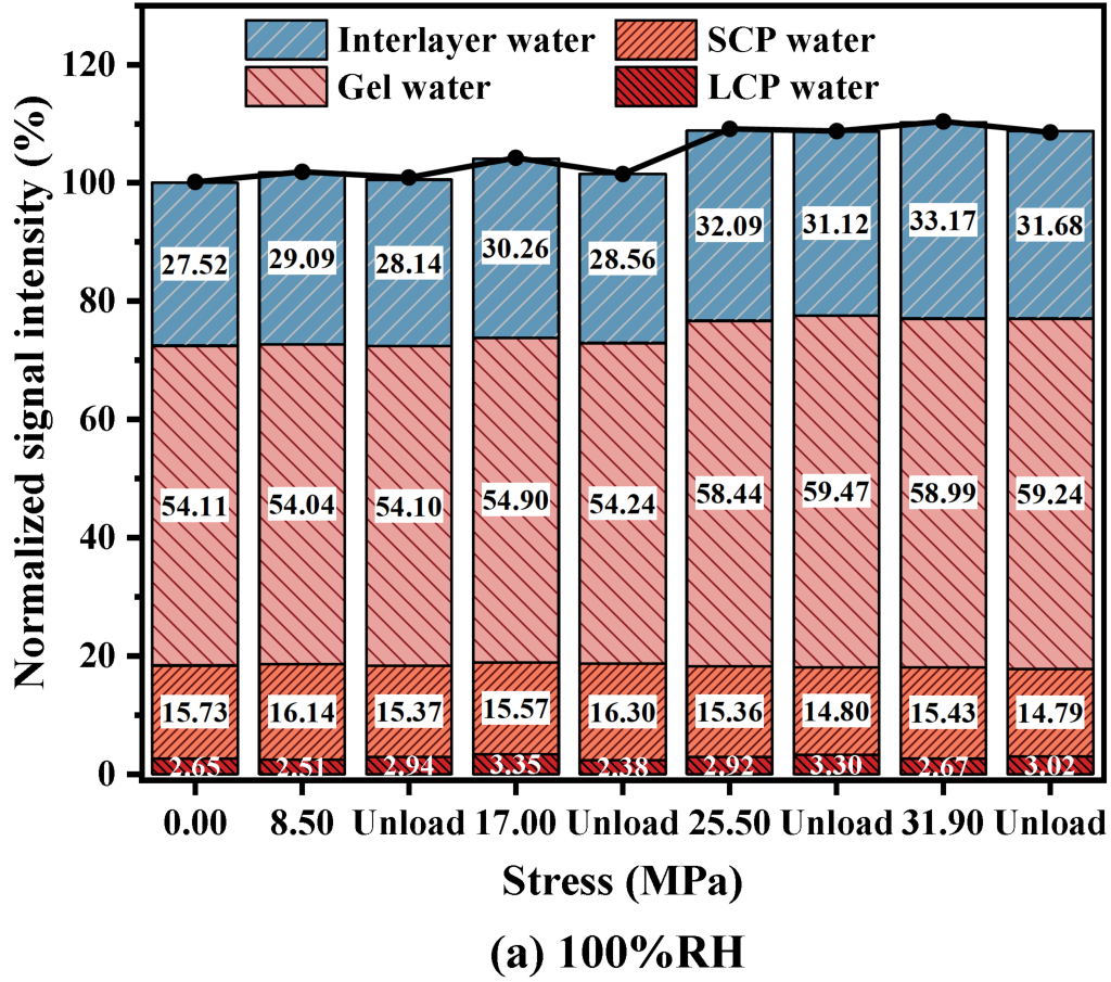 混凝土結構在服役過程中常常受到力與環境因素的顯著影響,軸向壓力與環境濕度是最常見的兩個因素。不同含水量硬化水泥漿體(HCP)在軸向壓力作用下的水遷移行為仍知之甚少。本研究引入了一種新型軸向壓力控制氫核磁共振(1H NMR)系統,對不同含水量HCP在不同應力水平加載過程中的應變變化和水分布進行了原位監測。結果表明,含水量的降低會減小C-S-H層間距,從而增加C-S-H凝膠的致密化程度,提高水泥基材料的力學性能。C-S-H層滑移的臨界點為平均層間距等于1.89 nm。在軸向壓荷載作用下,C-S-H凝膠被壓縮,導致部分凝膠孔隙重排為層間孔。因此,層間水含量增加,凝膠水含量減少。隨著應力水平的增加,層間含水量逐漸增加。當應力水平等于或超過臨界應力時達到最大值,此時水分遷移行為從完全可逆轉變為部分可逆。這些發現為HCP在機械荷載與水分遷移的耦合作用提供了寶貴的見解,對于預測混凝土結構在各種環境條件下的長期性能和耐久性至關重要。