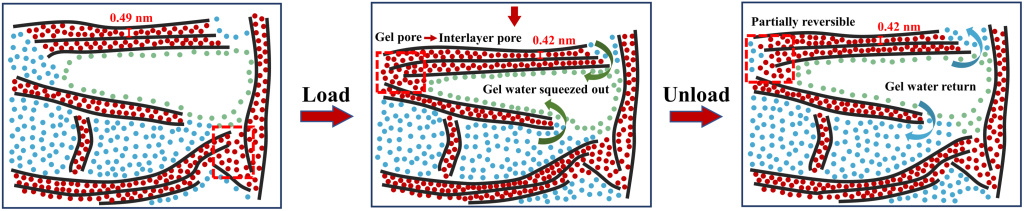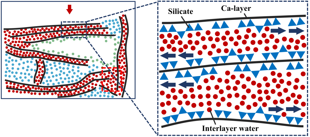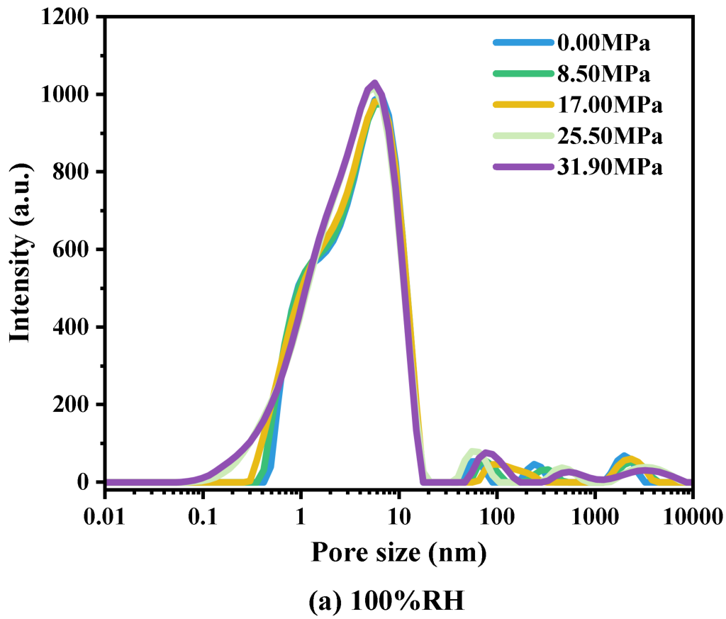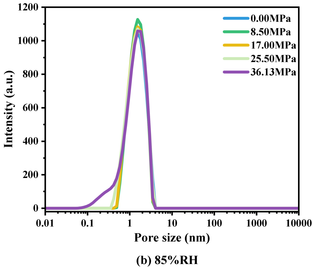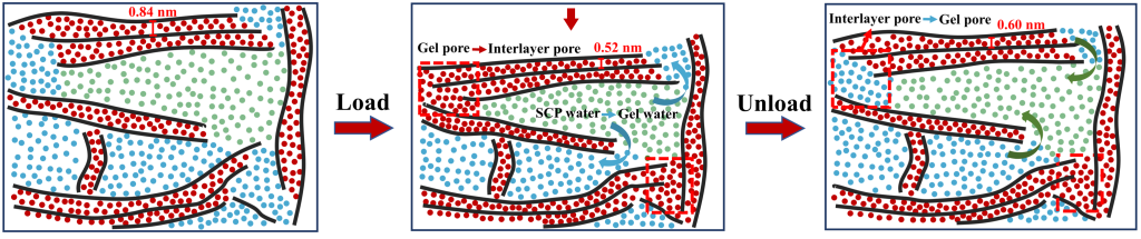 (3)壓荷載作用導致C-S-H層間距減小,部分凝膠孔向層間孔轉變,同時,層間孔孔徑減小。卸載時,受壓的層間孔被釋放,C-S-H層間距恢復,層間水重新轉變為凝膠水。這證明了微觀結構變化與水分遷移的密切聯系。