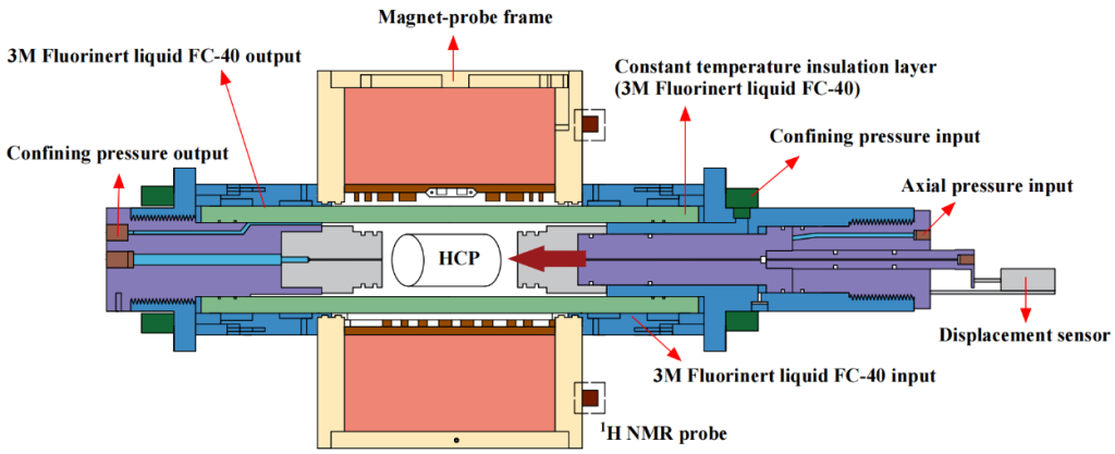 HCP內部水分分布的實時變化情況,揭示這一過程將有助于理解HCP體積變形機制。然而,過去關于水分遷移的研究受傳統方法限制,無法實時監測水泥基材料在壓荷載作用下的水分遷移過程。1H NMR技術可是一種利用水分子中質子的弛豫特性來測量?CBM 中水含量和分布的新方法。該技術能夠對同一樣品進行連續、無損的檢測,從而準確測試CBM在荷載作用下的水分遷移和重分布過程,是定量研究水分遷移的有力工具。在本研究中,采用1H NMR技術研究了不同相對濕度(RH)環境下?HCP 的水分平衡過程,并評估了達到平衡后的力學性能。此外,還設計了一套具有軸壓控制功能的1H NMR系統,用于在不同應力水平下原位監測?HCP 加載過程中的應變和水分分布變化。明確了不同類型孔隙水的水分遷移機制及其對?HCP 力學性能的影響,為CBM的變形機制提供了理論依據。