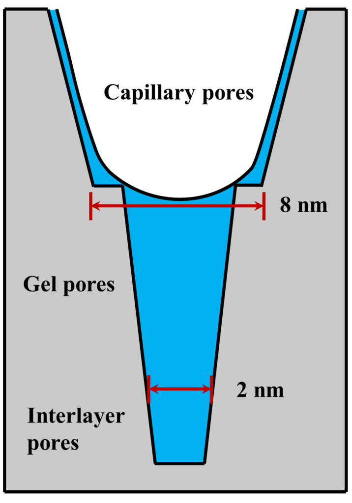 水作為水泥基材料(CBM)的重要組成部分,其在內部孔隙中的分布和遷移將對CBM的性能產生重要影響。根據硬化水泥漿體(HCP)內部孔隙類型,水泥基材料中的水可分為C-S-H層間水、凝膠水、小毛細孔水和大毛細孔水,如表1所示。C-S-H層間水和凝膠水共同存在于納米尺度的C-S-H凝膠中,是決定C-S-H凝膠微觀結構的重要因素。干燥過程中凝膠水和層間水的失去會導致C-S-H層間距減小,凝膠孔向層間孔轉變。當干燥狀態下的HCP再濕潤時,層間孔將重新恢復為凝膠孔。此外,C-S-H層間距影響HCP的徐變性能,C-S-H