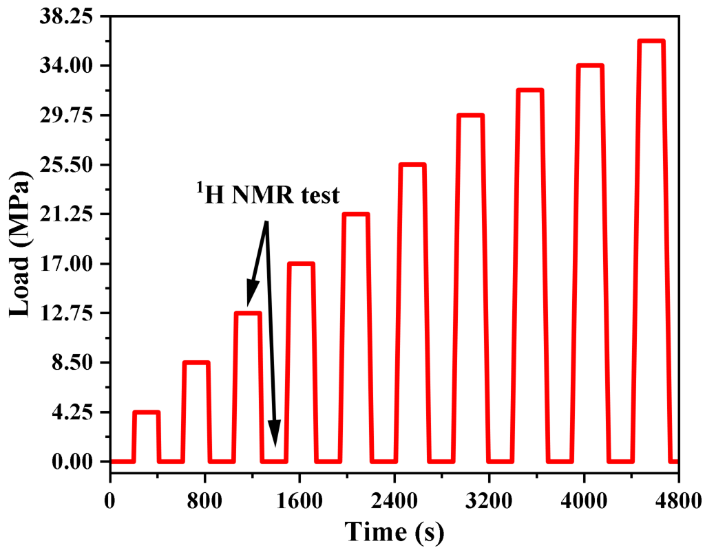 (4)按照圖2所示的加載方式對HCP進行加載,達到指定的荷載值時保持恒壓,隨后進行1H NMR測試,一次1H NMR測試約200 s。測試完成后立即卸壓,保持卸壓狀態對HCP進行1H NMR測試。