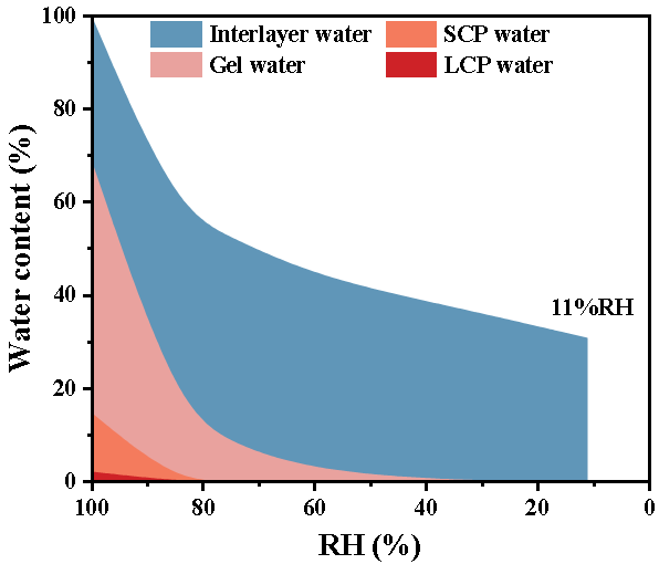 隨著RH降低,凝膠水含量顯著減少,層間水含量先增加后降低,這主要是由于凝膠水的失去導致C-S-H層間距的減小,凝膠孔向層間孔轉變。85% RH平衡后HCP內仍有16.45%的凝膠水和42.04%的層間水。59%RH平衡后HCP內凝膠水含量僅為1.99%,層間水含量達到41.61%。隨著RH的降低,層間水含量開始下降,11%RH平衡后HCP內部層間水含量僅為30.73%。